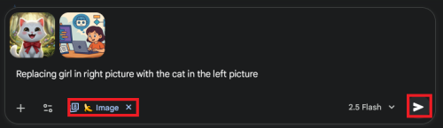 举例:我上传两张图片,然后写“我想要左边的猫代替右边图片里的女孩子”,按箭头按钮。